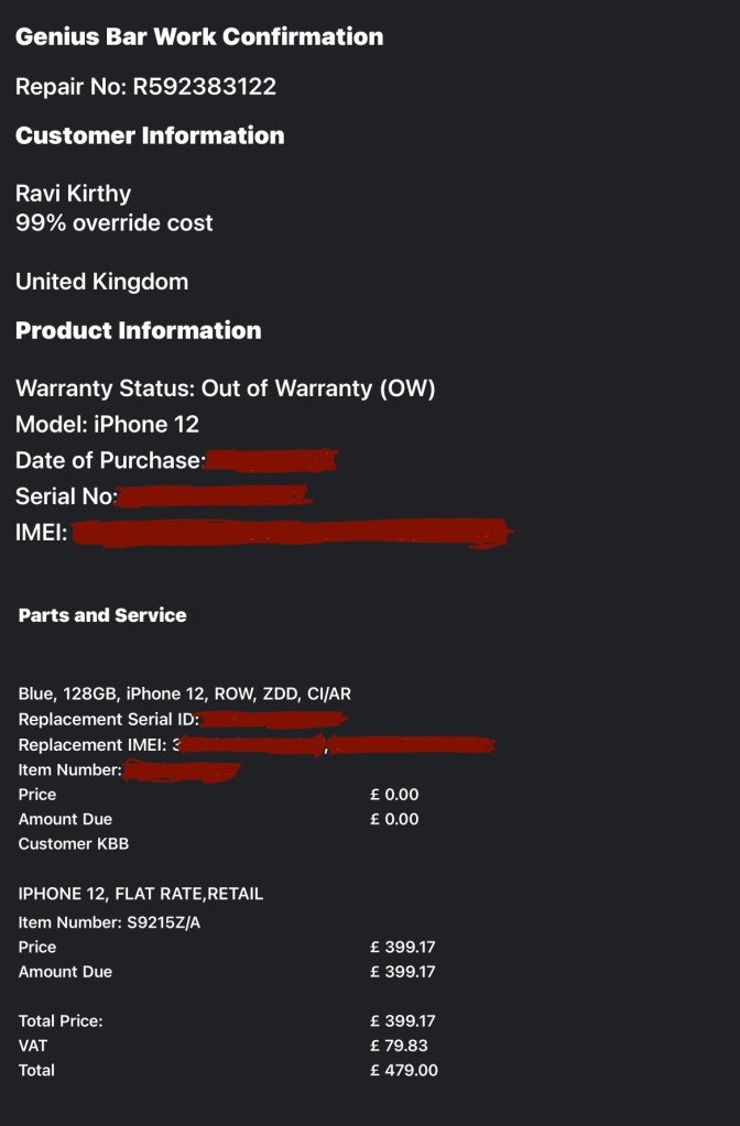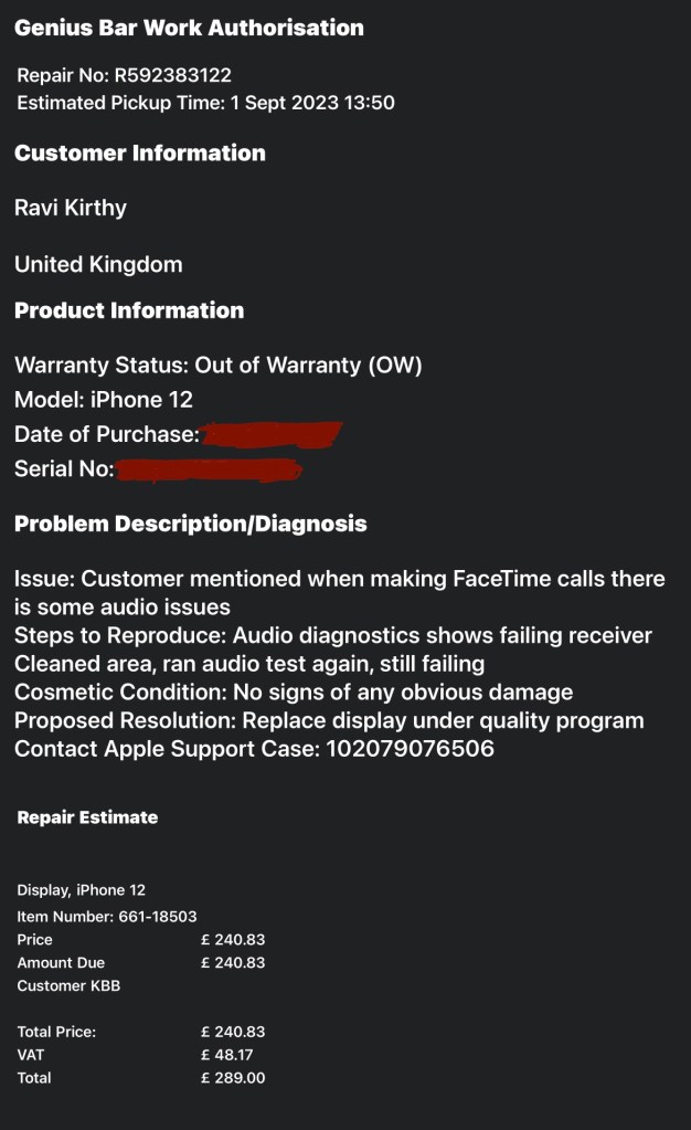 Well, here comes the plot twist. The support staff eventually returned, and it turned out the receiver was indeed faulty. The interesting part? Even though my phone was out of warranty, they offered to replace the receiver for free because it was a standard recall issue with many iPhone 12 models. But wait, there’s more! They also dropped the bombshell that they needed to replace the screen of my phone. Normally, this would cost a hefty £289, but they assured me it wouldn’t cost me a dime. The only catch? They mentioned there might be a bit of data loss, but nothing too major since this was supposed to be a straightforward fix. To seal the deal, I had to sign a document that looked suspiciously like a receipt for £289, and they told me to come back around 1:50 PM. Quite the rollercoaster of a visit!